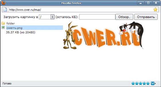 В открывшемся окне Браузера изображений снова нажимаем на кнопку "Обзор", выбираем необходимый рисунок и нажимаем кнопку "Отправить". Когда картинка загрузится, достаточно кликнуть по ней левой кнопкой мыши, и ее адрес и параметры вставятся в форму.