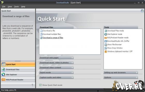 DownloadStudio - универсальная программа для скачивания файлов и сайтов из Интернета. С помощью данной программы вы можете скачивать файлы в многопоточном режиме, закачивать отдельные веб-страницы или целые сайты для последующего просмотра их в оффлайн-режиме. DownloadStudio имеет мощный комплект сервисных программ, которые позволят вам загружать все типы содержимого из веб – включая программы, игры, фотографии, музыку, фильмы, флэш, подкасты, RSS, блоги, документы, целые веб сайты и другое. Работает с последними версиями всех популярных веб браузеров, включая Internet Explorer, Firefox, Opera, Mozilla, Netscape, Maxthon, NetCaptor и Avant Browser.