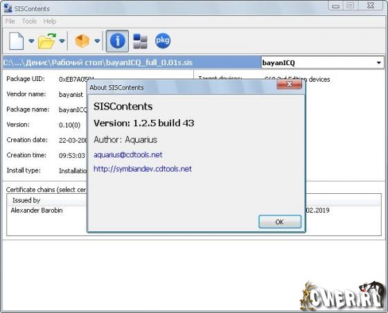 SISContents - программа для распаковки, редактирования и подписи установочных SIS пакетов операционной системы Symbian 9 (предназначенных для устройств на базе Nokia S60 3rd, 5th edition, Sony Ericsson UIQ 3.x).