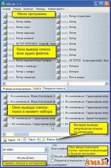 DjScanMusik 2.3 поисковая система аудио файлов,на локальном компьютере и сети интернет. Одновремено возможен поиск текстовых файлов и директорий.