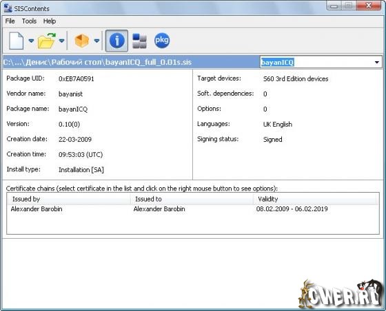 SISContents - программа для распаковки, редактирования и подписи установочных SIS пакетов операционной системы Symbian 9 (предназначенных для устройств на базе Nokia S60 3rd, 5th edition, Sony Ericsson UIQ 3.x).