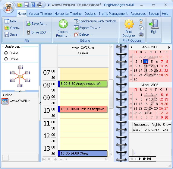 Универсальный календарь и органайзер. OrgScheduler поддерживает установку «скинов» и предоставляет пользователю возможность самостоятельно настроить систему «горячих» клавиш и опций, для увеличения удобства работы с приложением. Одним из преимуществ OrgScheduler является уникальный порядок отображения запланированных действий – одновременно показываются две календарные сетки, каждая из которых содержит тематически отсортированную информацию: работа, частная жизнь и др. Каждый из созданных подразделов снабжается определенной иконкой и заголовком, что позволяет очень быстро сориентироваться и отыскать необходимую информацию.