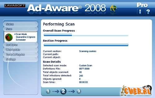 Ad-Aware 2008 Pro предназначена для поиска и устранения шпионских модулей. При своей работе Ad-Aware сканирует оперативную память, файлы на жёстком диске и определяет в них программы-шпионы и запущенные вредоносные процессы. Также сканируется реестр операционной системы. Если в реестре обнаруживается запись, установленная вредоносной программой, то она удаляется. Работает Ad-Aware достаточно шустро, настройки просты и интуитивно понятны. Если обнаруживаются шпионские модули, то программа предлагает удалить их все или выборочно. Для предотвращения случайного удаления нужного файла или записи в реестре предусмотрена функция восстановления (для этого автоматически создаются backup-копии удаляемых данных). Данная программа (или аналог) должна быть у каждого пользователя, который работает на компьютере в Интернете. Проверять и удалять из системы шпионов просто необходимо.