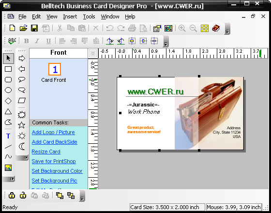 Belltech Business Card Designer Pro поможет Вам создать и распечатать свои визитные карточки, основываясь на профессиональных образцах и графических знаках фирмы. Распечатывайте свои визитные карточки на любом принтере, совместимом с Windows. Данная программа по созданию визитных карточек работает с различной бумагой - Avery, Sigel, DECAdry, Herma, Formtec и др. В предлагаемой программе предусмотрены отличные средства для дизайна, графика и фоновые изображения, что позволит Вам создать визитную карточку, соответствующую Вашей фирме. Вы сможете добавлять свой графический знак, текст, применять теневой эффект, цвет, изменять дизайн до тех пор, пока не будете довольны результатом.