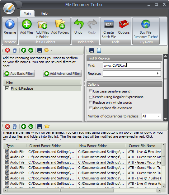 File Renamer Turbo - это новейший инструмент, который значительно облегчит вашу жизнь! Если вам нужно переименовать несколько файлов или заполнить ID3 тэги к MP3 файлам и музыкальные тэги к WMA, M4A, OGG, FLAC, APE или MPC файлам, эта программа сделают всю работу за пару минут. Программа проста в использовании и обладает всей функциональностью, которая вам будет нужна.